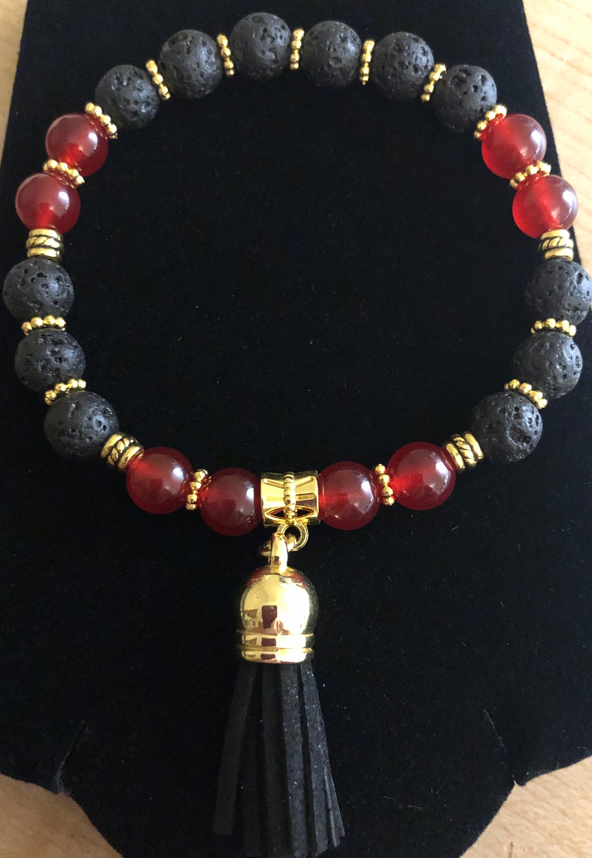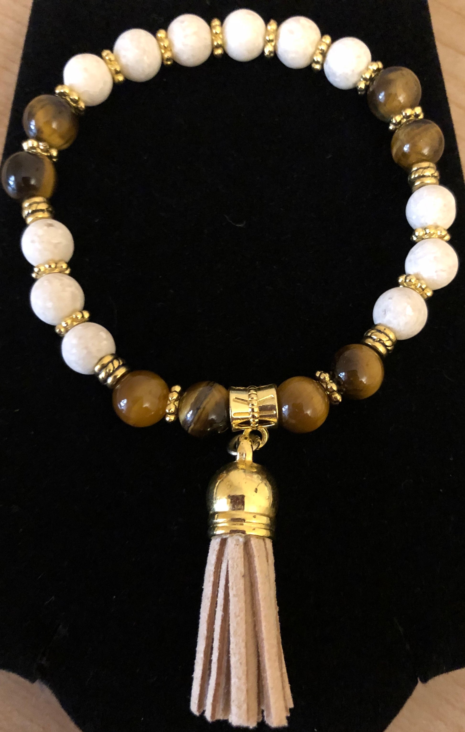 These beautiful, handcrafted gemstone tassel bracelets are the prefect piece of jewelry that can be dressed up or dressed down. The gemstones represent courage, strength, love, spiritual clarity and wisdom, they are offered in gold tone accents and silver tone accents (not shown), the tassels are made of faux suede.