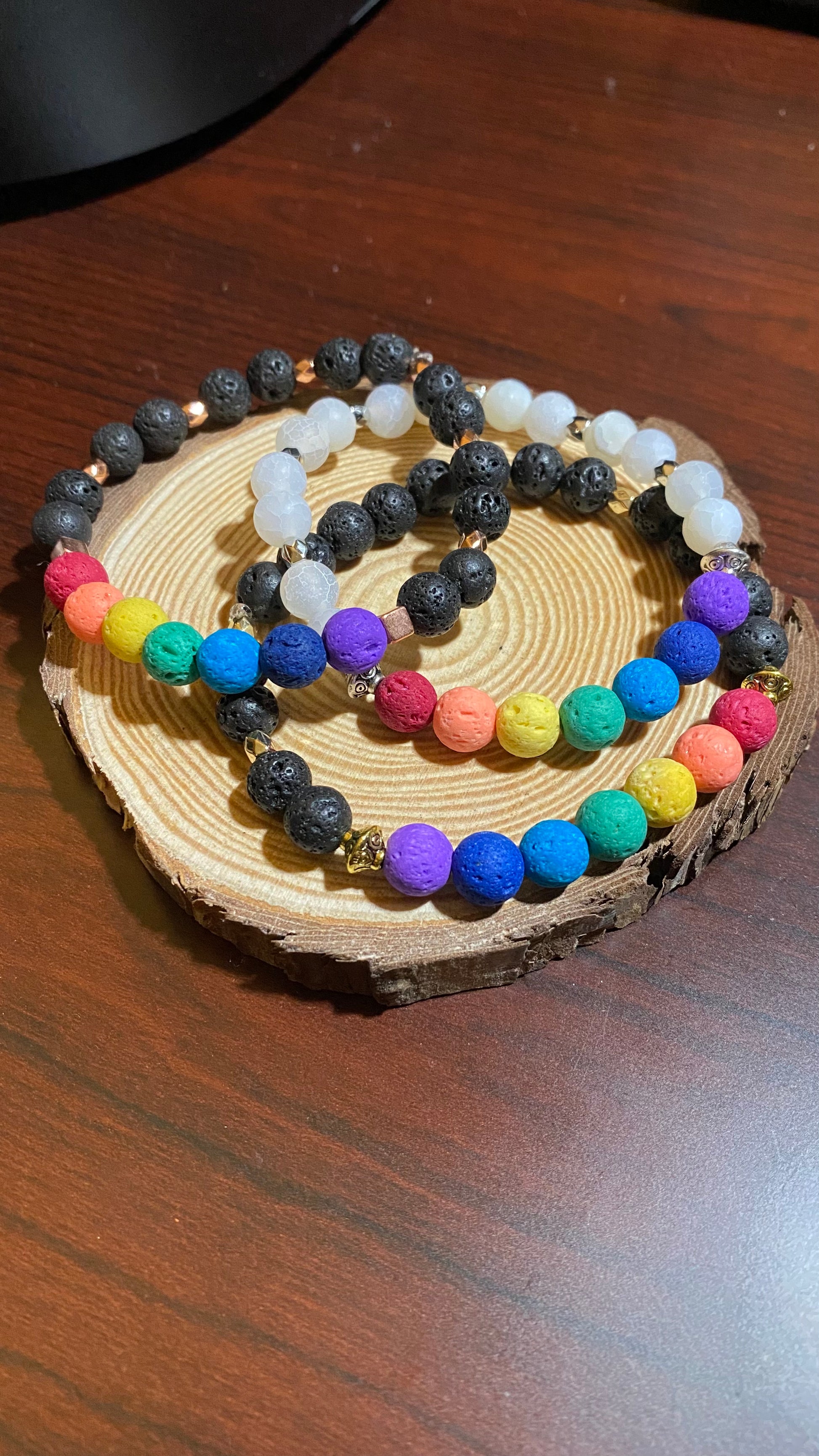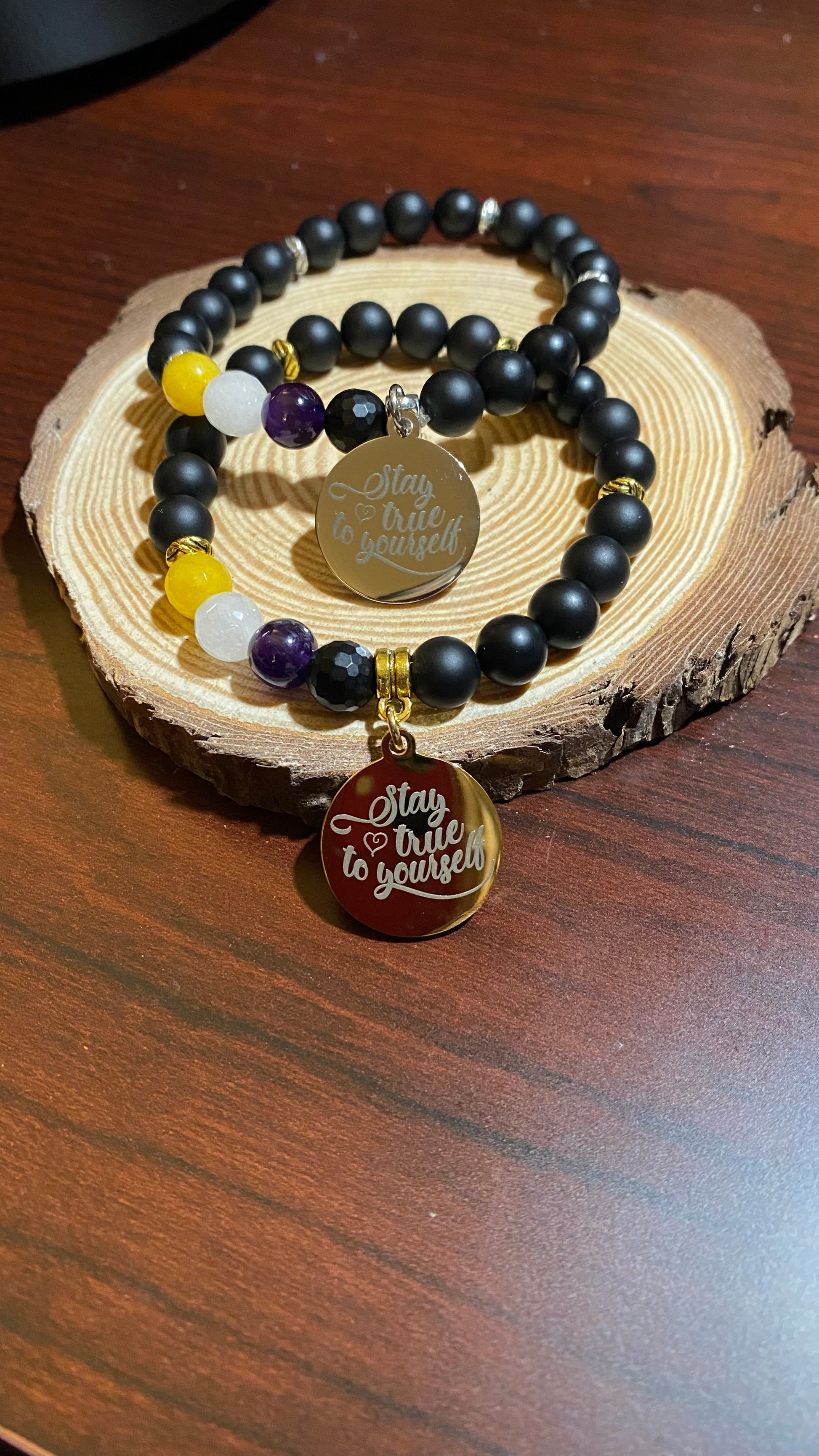 These beautiful, handcrafted bracelets are made to acknowledge the LGBTQIA Community and their supporters. Made with a variety of gemstones but the main stone is Onyx, which is a stone of protection and strength, Onyx also dispels negative energies and prevents your own energy from being drained. Stones used Rose Quartz, Crystal Quartz, Blue Lace Agate, Rainbow Lava Rock, Yellow jade, Crystal Quartz, Amethyst.